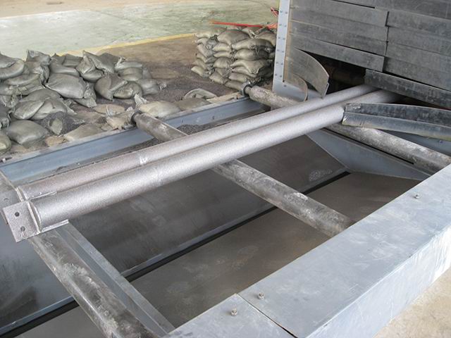 后工件表面表面的光潔度和粗糙度符合有關(guān)的標準規(guī)定。小口徑的鋼管使用內(nèi)壁噴丸機,鋼管內(nèi)壁噴丸處理線,主要包括移動臺車,砂斗,噴砂罐,噴槍,噴槍承載車,鋼管承載系統(tǒng),底部彈丸